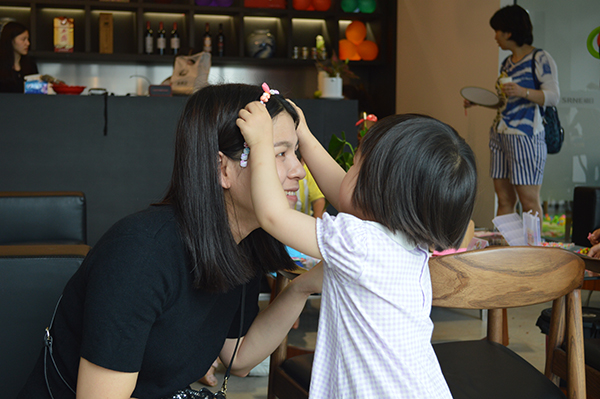 手工創(chuàng)作:剛從菜園里戀戀不舍離開,擁有無限的活力小朋友們仍然精力充沛。接下來是手工環(huán)節(jié),小朋友在媽媽的指導下完成作品,代表自己的點點心意,親手送給媽媽。
