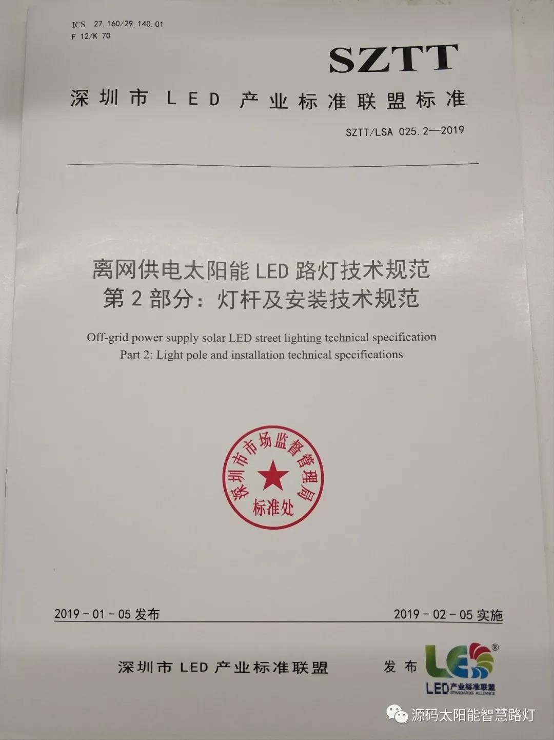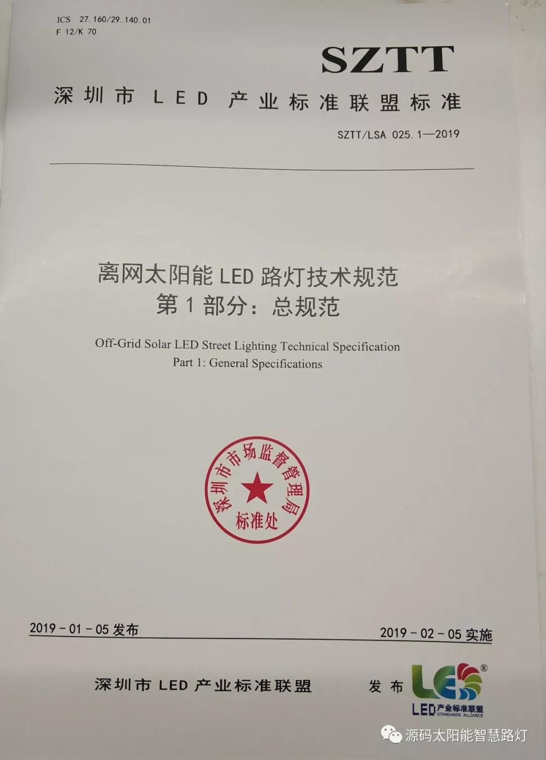 2019年1月5日,深圳市LED產(chǎn)業(yè)標(biāo)準(zhǔn)聯(lián)盟首次正式對(duì)外發(fā)布了《離網(wǎng)太陽(yáng)能LED路燈技術(shù)規(guī)范》聯(lián)盟標(biāo)準(zhǔn)。《離網(wǎng)太陽(yáng)能LED路燈技術(shù)規(guī)范》聯(lián)盟標(biāo)準(zhǔn)包含SZTT/LSA 025.1-2019《總規(guī)范》和SZTT/LSA 025.2-2019《燈桿及安裝技術(shù)規(guī)范》兩部分,主要由深圳源創(chuàng)智能照明有限公司、深圳市計(jì)量質(zhì)量檢測(cè)研究院、深圳清華大學(xué)研究院、深圳市標(biāo)準(zhǔn)技術(shù)研究院、國(guó)家半導(dǎo)體光源產(chǎn)品質(zhì)量監(jiān)督檢驗(yàn)中心、廣東省南粵質(zhì)量技術(shù)研究院等共同起草。